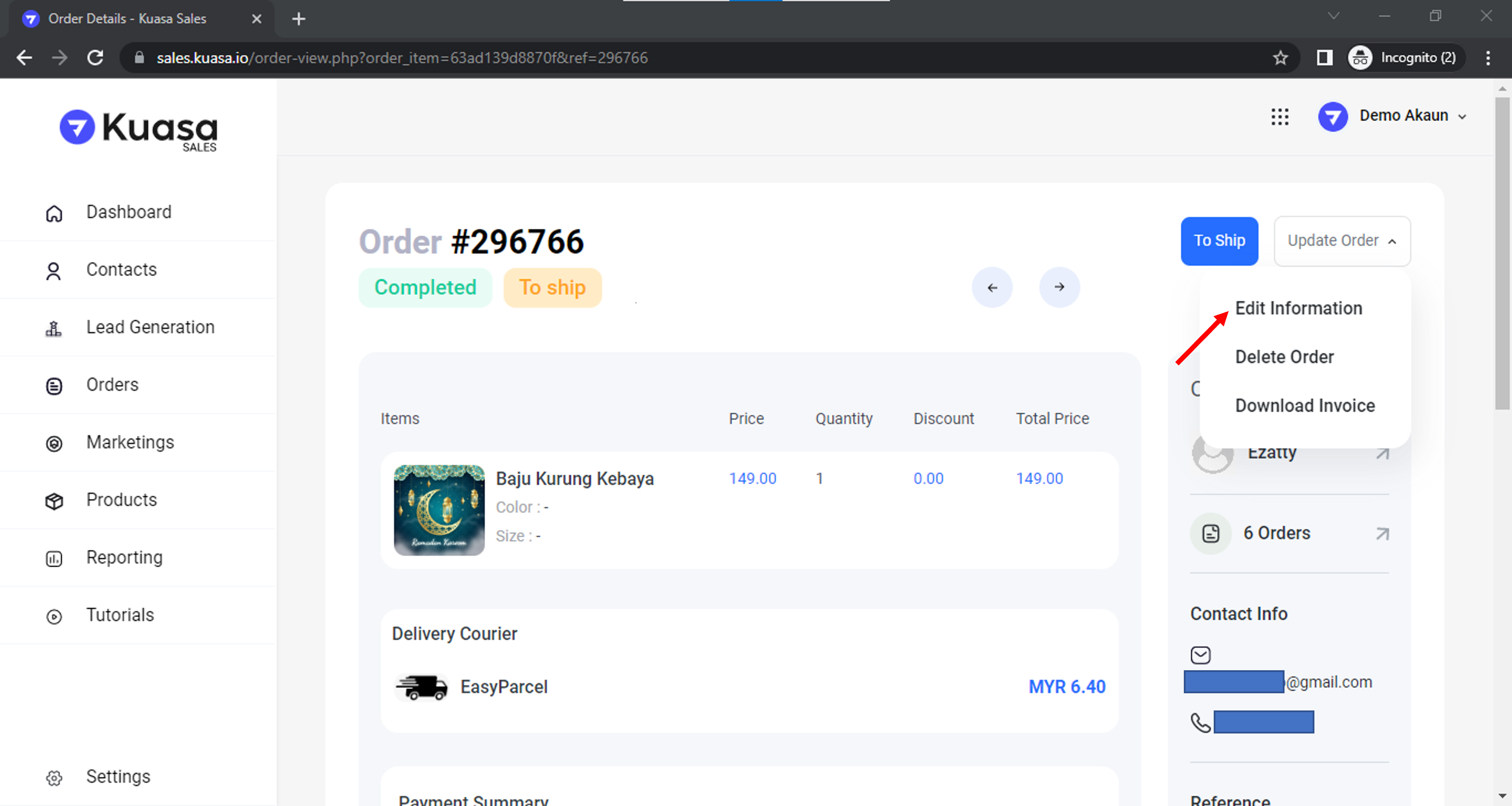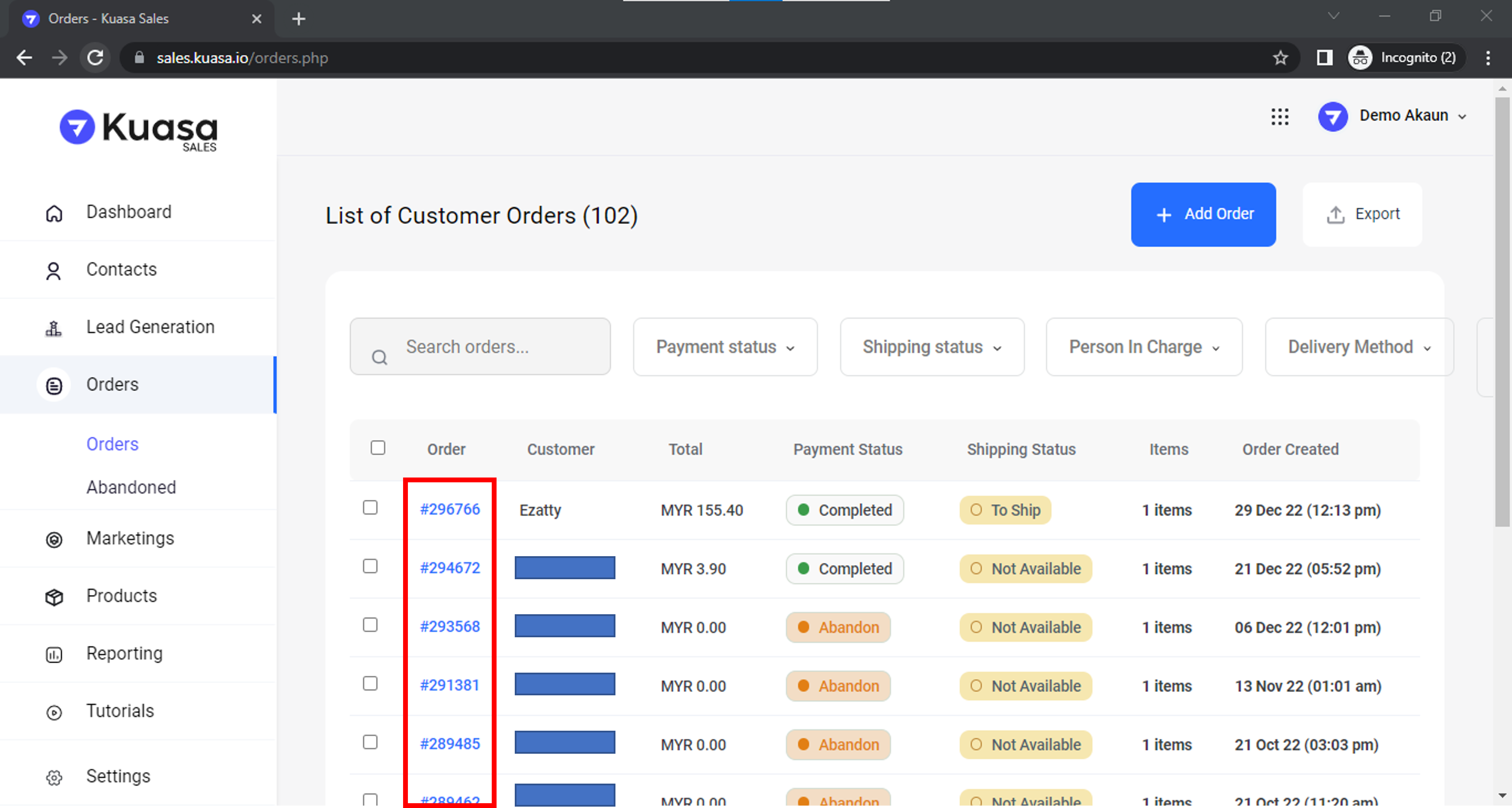 3\. Klik pada nombor order untuk mula kemas kini maklumat order.