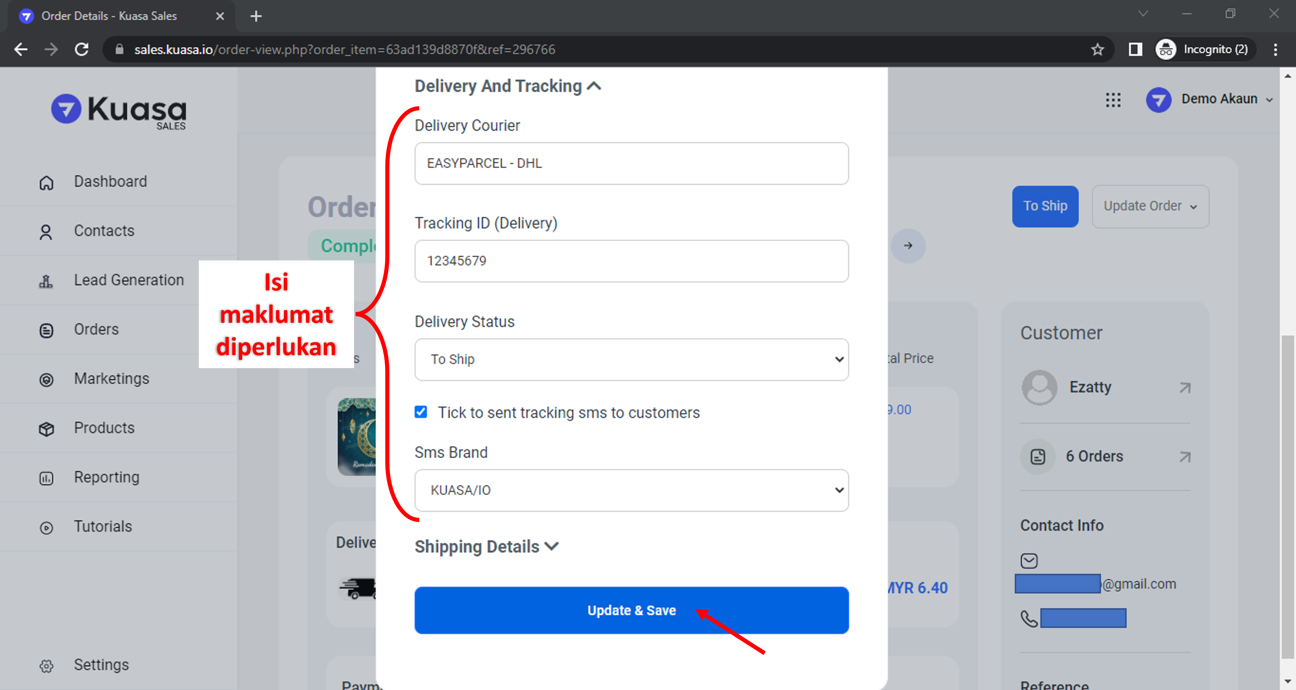 6\. Pergi ke bahagian **Delivery And Tracking**. Isi maklumat yang diperlukan, tandakan di bahagian **Tick to sent tracking sms to customers**. Kemudian, klik **Update & Save**.